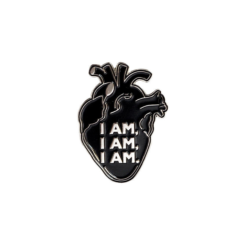 This enamel pin is a literature-inspired accessory, featuring the famous phrase "I am, i am, i am" from Sylvia Plath's poetry.